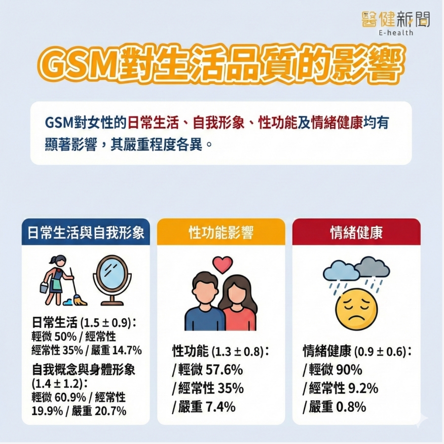 嚴絢上表示,該研究確認了日常活動、性功能與性活躍狀態之間存在顯著關聯(p<0.05),研究顯示,雖然性活躍婦女在某些事件感受更明顯,但非性活躍婦女同樣受到日常活動、自我形象、情緒健康的影響,治療目標不只是緩解陰道不適,更要改善婦女的自尊、身體形象和情緒健康,因此,需要採取多學科整合方式進行個人化管理,GSM不是「正常老化」,而是需要正視和治療的健康問題。主要發現包括: