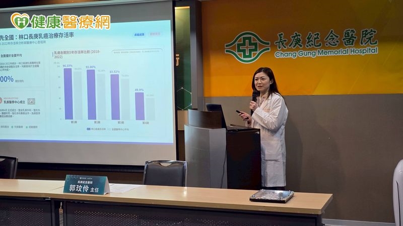 ▲郭玟伶主任說明林口長庚醫院統計2018至2022年乳癌治療存活率。(圖/長庚醫院提供)
