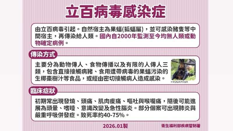疾管署官網資訊說明,立百病毒感染症為人畜共通傳染病,其自然宿主為果蝠(狐蝠屬),並可感染豬隻等中間宿主,再傳染給人類。傳播途徑主要分為動物傳人、食物傳播及有限的人傳人3類,包含直接接觸病豬、食用受果蝠(狐蝠屬)尿液或唾液污染的食品等,或經由密切接觸病人的血液、體液、呼吸道分泌物造成感染,而臨床症狀表現廣泛,包括無症狀感染、急性呼吸道症狀到致命性腦炎均可能發生。