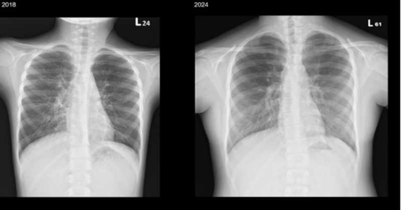 ▲林小妹於2018年、2025年所攝胸部X光片,楊佳鳳主任表示,成像愈黑,代表肺功能較好,可見她歷經7年專業照護,肺功能維持穩定。(圖/北榮提供)