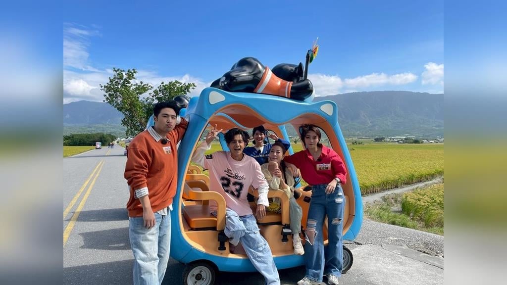 民視、八大《綜藝新時代》本次來到台東池上,主持人阿翔、楊繡惠、張文綺以及藝人來賓鹿希派開著可愛近期最夯的狗狗造型電動車,在遼闊的伯朗大道開場,阿翔表示在這裡最知名的地標金城武樹,坐在椅子上都需要有感觸的心境,營造氛圍感,並裝文青口白示範「世界越快,心越慢」。