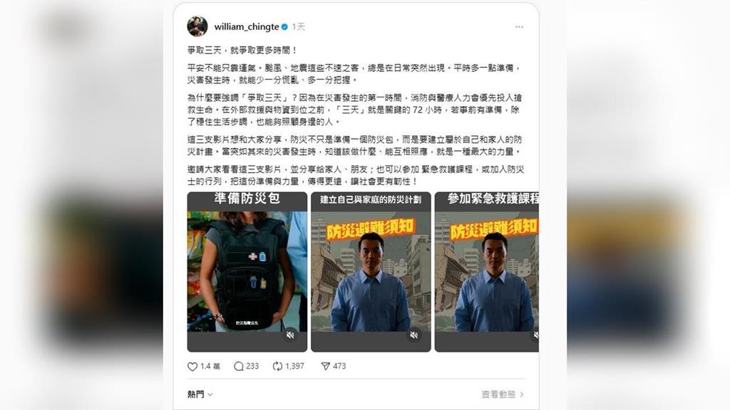 不僅如此,蕭美琴也以「災難來臨時,真正能保護我們的,是平時是否做好準備」為題發文,她說,「爭取3天」,指的是災害發生後黃金72小時。平時做好儲備3天災難生存力的準備,在外部支援與物資完全到位之前,就能少一分恐慌、多一分安全。