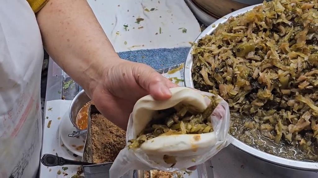白白的刈包皮鋪上滿滿的酸菜,加上幾塊肥瘦相間的滷肉,在鋪上香菜跟花生粉,讓人看了食指大動。尾牙這一天,基隆廟口這間老牌的刈包店,一大早就吸引民眾排隊購買。