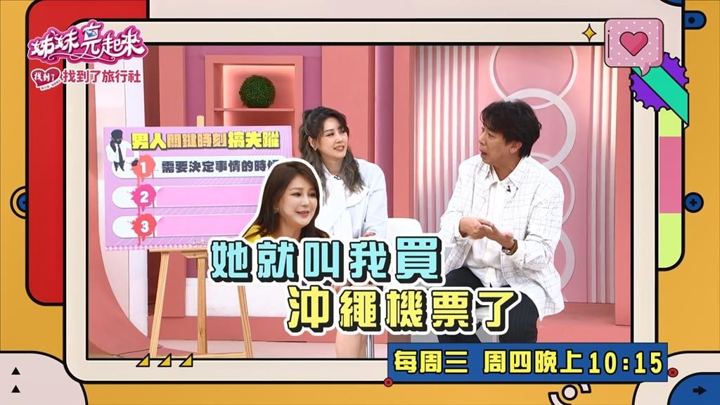 梁赫群說到老婆超級急性子,經常被迫下決定!他們假日都會帶小孩外出走走,有次到了三峽老街,太太突然就拿著手機對著他說:你看看這價錢很OK,沒問題就趕快按了!心想這麼東西?仔細一看是去沖繩的機票!想說現在在弄這個幹嘛!我們在逛三峽老街耶!然後太太就說這是下週中秋節要去玩的地方,這價格是浮動的,若不快按,很快就漲價了。心想還要看其它航空比價一下,但她說不能跳頁面,等等就找不回來了!沒有任何討論及選擇的餘地,所以不完全是男人搞失踪。每周三、四晚上10:15由梁赫群以及嚴立婷主持的《姊妹亮起來》記得收看起來!