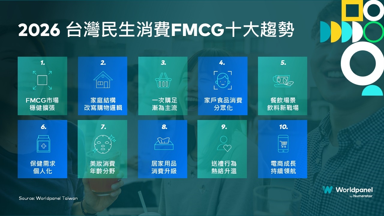 在消費者對日常品質需求提升、品牌與通路競爭加劇的市場環境下,民生消費品 (FMCG)產業正迎來新的成長契機。Worldpanel by Numerator消費者指數(原凱度消費者指數)發布最新研究《2026 台灣民生消費十大趨勢》,透過長期追蹤台灣消費者實際購買行為,解析2026年影響 FMCG 市場發展的關鍵消費趨勢,並邀請凱絡媒體從媒體視角分享市場觀察,協助品牌與通路掌握未來布局方向。
