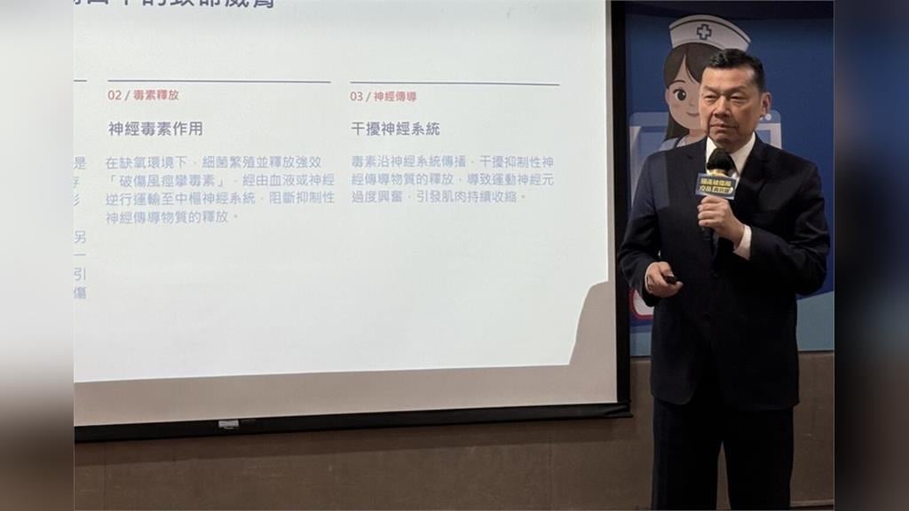 林宏榮說,破傷風主要是破傷風桿菌的外毒素(exotoxin),透過一般外傷傷口、撕裂傷、燒傷等入侵血液而引起,其特徵為痛性之肌肉收縮,包括牙關緊閉、痙攣、全身僵硬等都是典型症狀,嚴重可能併發肺栓塞、呼吸困難而有死亡風險。平均3至21天會發病,又以14天左右最為常見。