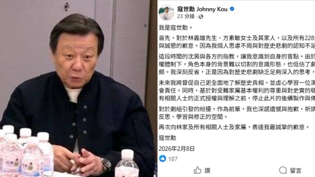 寇世勳透過臉書發文,「首先,對於林義雄先生、方素敏女士及其家人,以及所有228受難者與家屬遺族,我致上最深沉的哀悼與誠懇的歉意。因為我個人思慮不周與對歷史悲劇的認知不足,對各位造成了二次傷害,我深感自責」。
