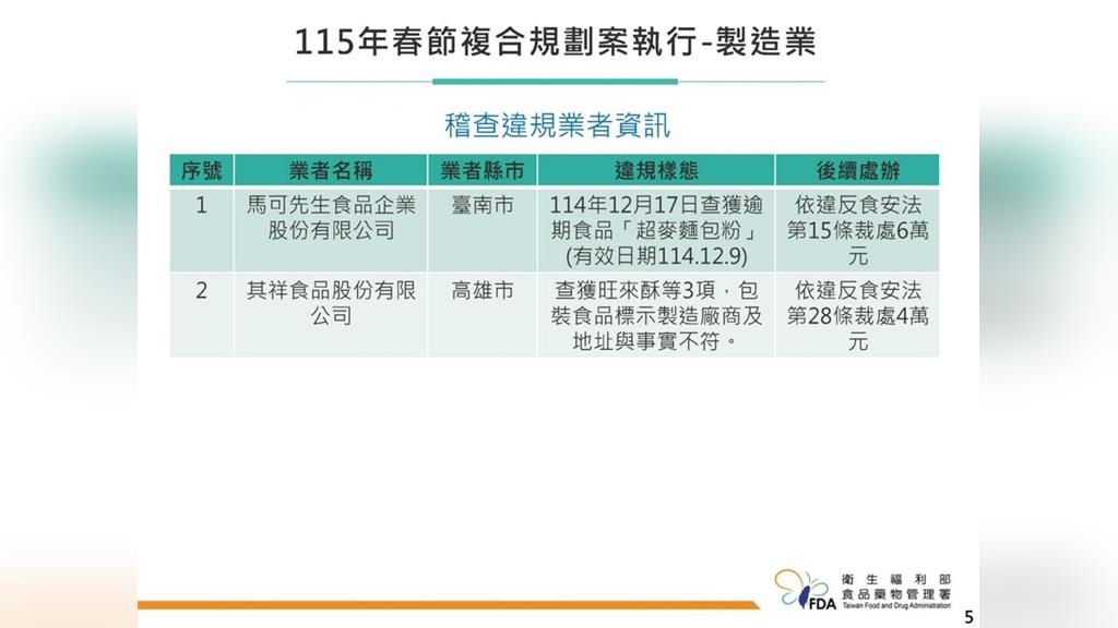 CNEWS匯流新聞網記者陳鈞凱/台北報導食藥署今(11)日公布「115年春節複合式規劃案」稽查春節應景食品結果,一口氣發現二件逾期食品,其中包括在馬可先生台南仁德廠內查獲存放逾期8天的「超麥麵包粉」二大箱、10公斤,另外,君達育樂事業股份有限公司花蓮分公司也禮查獲存放逾期9天的「濃縮橙汁調飲」一瓶2000cc,儘管兩家業者都未開封,仍被分別開罰新台幣6萬元。