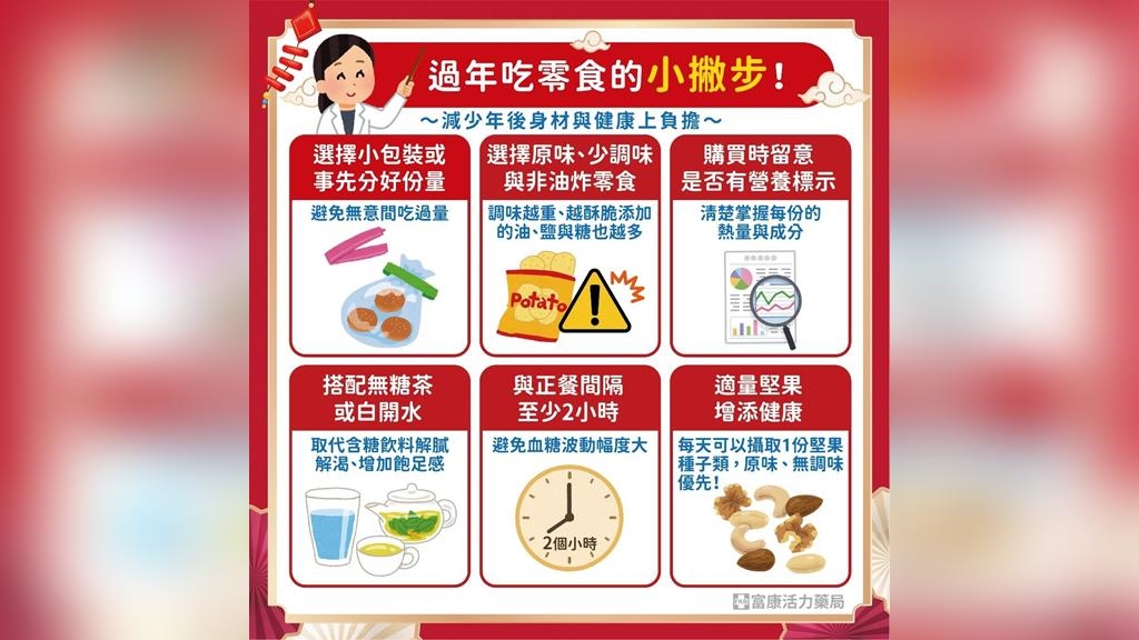 富康活力藥局營養師王玟涵指出,春節期間體重增加,往往不是某一餐吃太多,而是「零食攝取頻率提高」加上活動量下降,讓熱量持續累積所造成。只要掌握零食選擇與進食時機,其實不必完全忌口,也能兼顧年節氣氛與身體負擔。