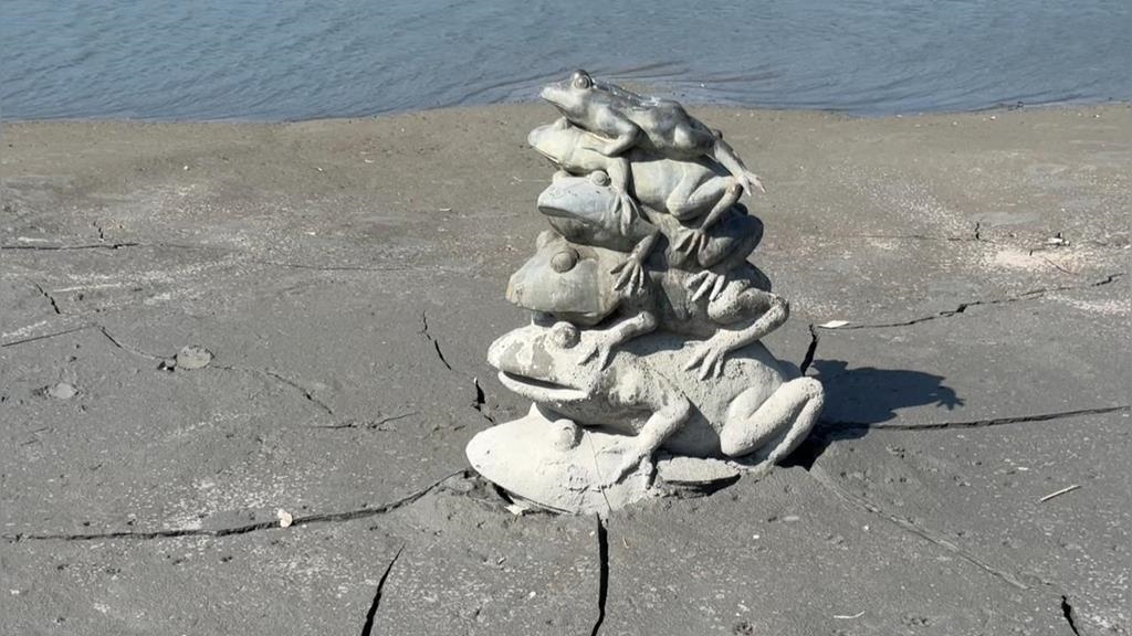 大太陽下,6隻青蛙,由大而小,一隻疊著一隻,不過其實底層還有3隻,埋在淤泥下方,南投知名景點,也象徵著日月潭水情的"九蛙疊像",目前有6蛙明顯露出水面,3蛙在淤泥裡,9蛙全露,也代表日月潭開始進入枯水期,