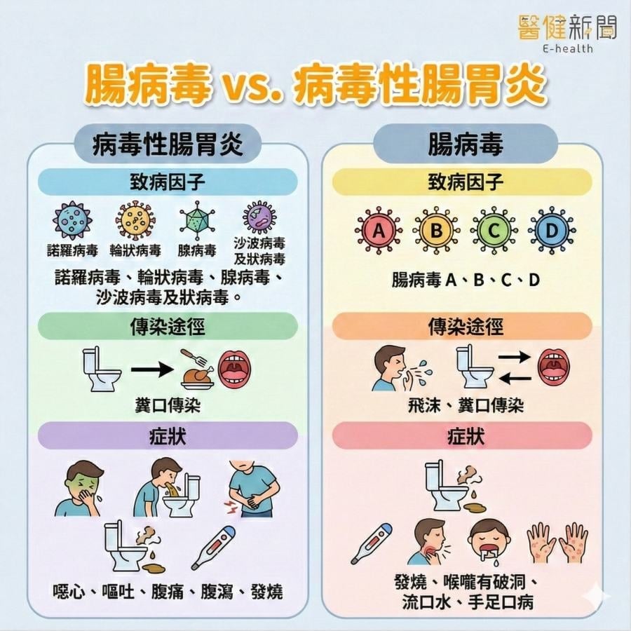 腸胃炎:腸胃炎主要由多種病毒引起的腸胃道炎症,包括諾羅病毒、輪狀病毒、腺病毒40或 41型、沙波病毒及狀病毒。致病因子專注於腸胃系統,並不會如腸病毒般引起其他部位的症狀。