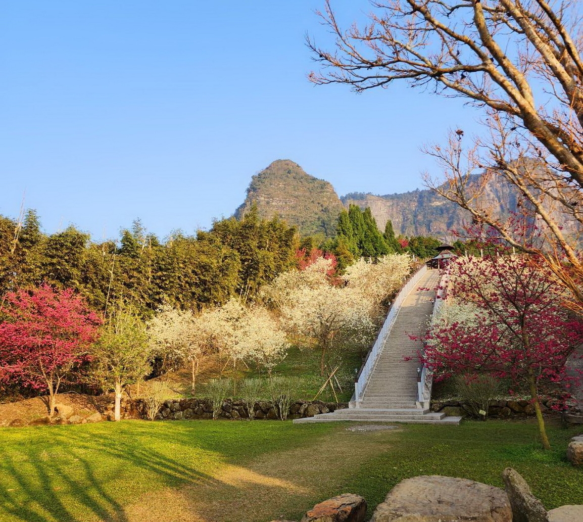 圖、文/引新聞(記者黃信峯/嘉義報導)嘉義縣梅山鄉太和村「寒溪呢森林人文叡地」,素有「世外桃源」之稱,園區創辦人施力文老師規畫園區內的祈願石、八卦陣、虹橋、太極亭、1166盟山祈福亭等特殊景觀都有特殊的涵義,因此吸引眾多愛好大自然遊客紛紛上山觀賞。值得一提的是,園區內除了獨有的台灣特有種「福爾摩沙白櫻花」及緋寒櫻繽紛盛開,另還有八重櫻、富士櫻、霧社白櫻、吉野櫻及絕美的紅笠櫻花,從春節期間開始依序綻放到三月底,成為聖塔山群峰前的櫻花世界,讓遊客在此壯麗又充滿活力的大自然環境中,是一處絕佳的景點。