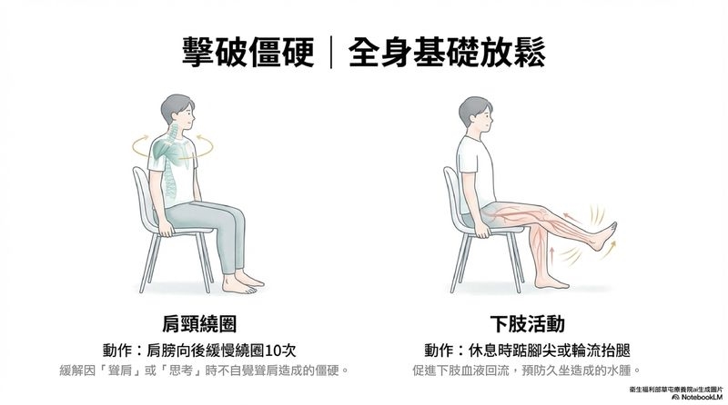 - 肩頸繞圈:肩膀緩慢向後繞圈10次,緩解因「摸牌」或「思考」造成的聳肩僵硬。