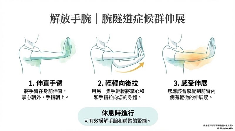 - 手掌推牆:腕隧道症候群伸展(正中神經放鬆)