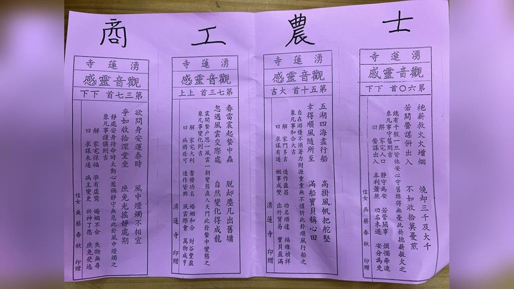 即時中心/綜合報導新北市蘆洲湧蓮寺在16日除夕夜,由主委陳宏昌抽出國運籤,士、農、工、商分別抽到「下下」、「大吉」、「上上」、「下下」籤。其中,「士」抽到下下籤,若以當前局勢來看,意指朝野不宜內鬥,執政者推動政策應審慎評估、穩健前行。