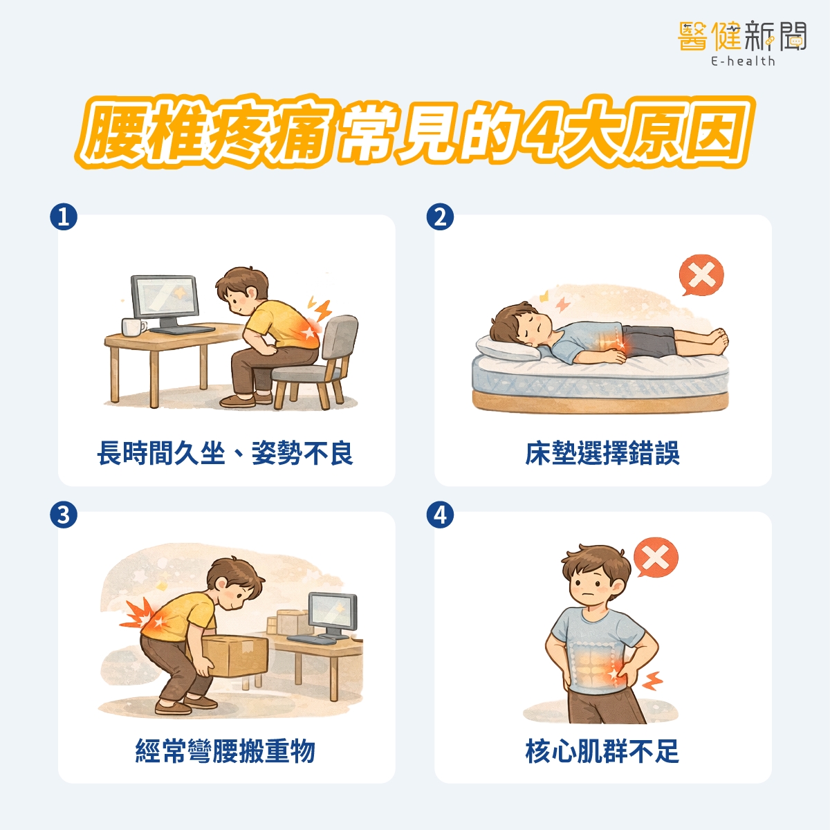 1.突發性勞動:像頻繁掃地、提重物等,若不小心姿勢不當,都可能增加增加腰椎壓力,甚至有肌肉拉傷風險。吳孟庭表示,尤其當核心肌群力量不足、腰椎缺乏支撐,椎間盤與關節長期受力不均,就容易導致下背部痠痛、緊繃感。