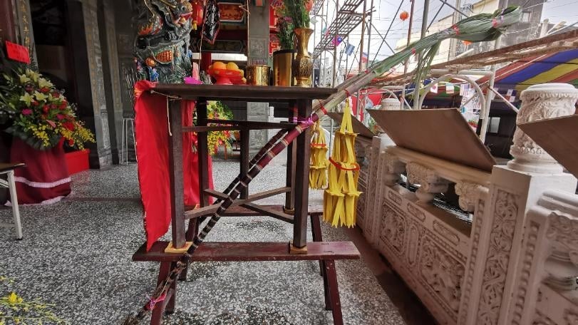 二、簡單式:供桌沒有「頂桌」和「下桌」,只有單一平面,在家門口外沒有遮蔽的的地方設供桌,就像平常拜門口一樣,只有平常的供桌,但為求尊崇之意,會在供桌的四隻腳底下墊上壽金,供品一定要素的,絕對不可以拜葷食!一般是5種水果。