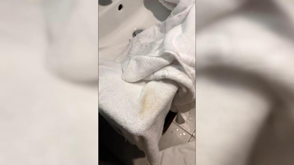 入住民眾表示:「拿到的同時我們就覺得奇怪,這個手感是潮濕的潮濕的毛巾,那一攤開來看發現,有明顯的褐色污漬在上面。」