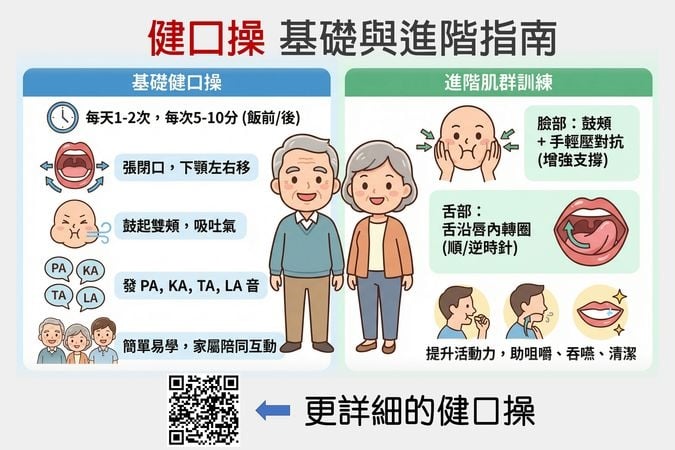 健口操實際動作,可安排於飯前或飯後進行,張欽凱醫師建議,每天一到兩次,每次約五到十分鐘即可。動作包括反覆張口、閉口與左右移動下顎,訓練咬合與下顎穩定度,再搭配鼓起雙頰、吸氣吐氣,以及「PA、KA、TA、LA」的發音練習,強化口唇與臉頰肌群。動作簡單易學,長輩可在家自行操作,家屬也能陪同一起練習,增加互動與持續性。
