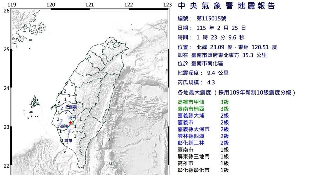 睡不安穩!凌晨台南南化連2震 最大震度3級