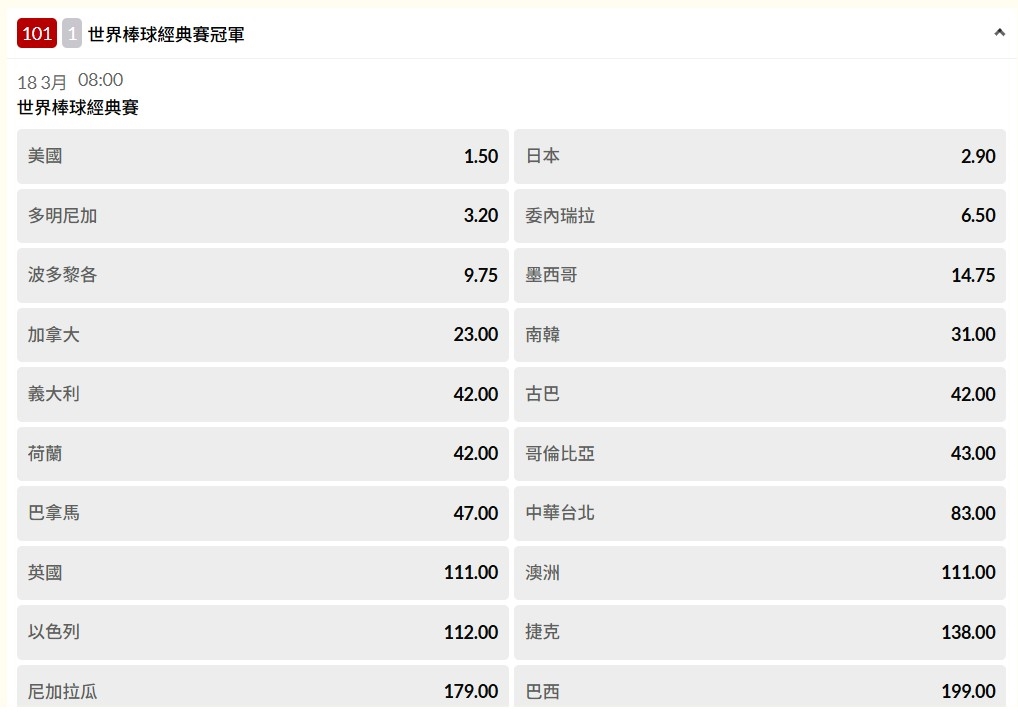 跟中華台北同組的南韓,賠率31倍、澳洲111倍、捷克138倍。