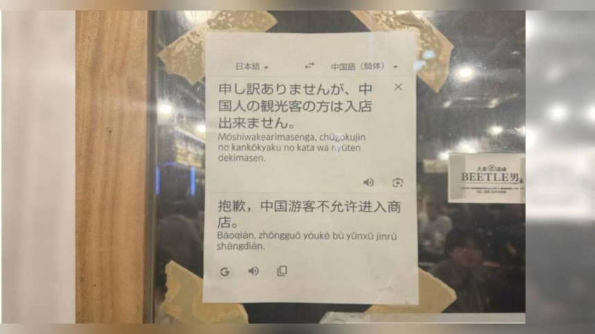日本首相高市早苗在去(2025)年11月發表「台灣有事」言論,使中日關係惡化,中方外交部甚至呼籲民眾避免前往日本旅遊。而最近日本鹿兒島一間居酒屋「大眾酒場BEETLE男」外張貼拒絕中國遊客入店的告示,此消息曝光後,在網上引發討論,有人質疑涉及國籍歧視,甚至有中國網友喊要報警。