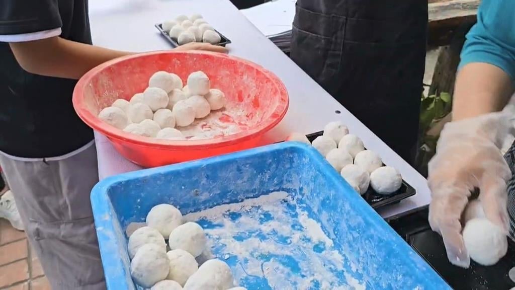 白白胖胖的元宵,裹上滿滿糯米粉,一顆顆圓滾滾,店員的手沒停過,店門口早就大排長龍。隊伍綿延好幾十公尺,大家都是來搶買限量手工元宵,店還沒開門就有人來排隊。民眾:「同事7點多就來排隊,試試看味道怎麼樣,看還蠻多人在排隊。」民眾:「這間很有名啊,然後真的很好吃,就是煮起來那個皮的Q度,跟一般市售的不一樣。」渾圓外型,傳統習俗代表家家戶戶團圓、幸福,台南這一間40年老字號點心店,純手工製作元宵,每年元宵節前開賣,因為做起來費時費工,一年就只賣這五天,每人限購3盒。