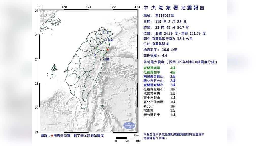 最新消息!今(28)日晚間23時49分,宜蘭縣近海發生規模4.4地震,最大震度宜蘭縣南澳、花蓮縣和平4級。