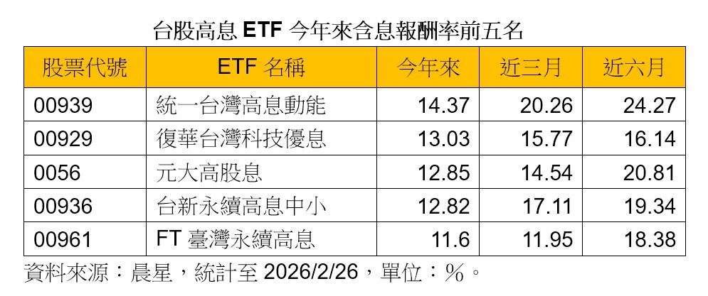 中東戰火重燃,引起市場不安,法人關注高股息ETF能否抗跌演出。統計今年以來截至2月底的含息報酬率,前五名依序為統一台灣高息動能(00939)的14.37%、復華台灣科技優息(00929)的13.03%、元大高股息(0056)的12.85%、台新永續高息中小(00936)的12.82%、FT臺灣永續高息(00961)的11.6%。