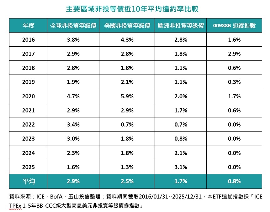 根據數據統計,近10年來全球非投資等級債的平均違約率為2.9%,美國非投資級債同期間違約率亦有2.5%,而目前正在募集期間的玉山嚴選非投債ETF(00988B)追蹤指數近10年來的平均違約率不到1%,甚至2022年至2025年連續4個年度的違約率皆為0%。