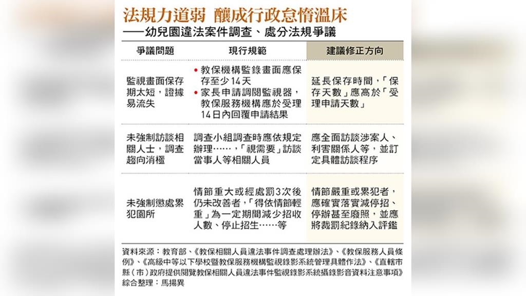 然而,正是「延遲通報」的罰則過輕、監視器保存期限太短,加上種種法規執行的彈性,一次又一次成為行政怠惰、輕縱不肖幼兒園與惡師的溫床。
