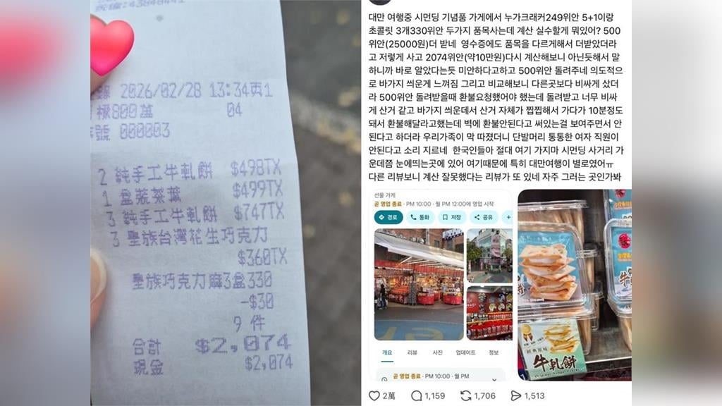 該名韓國旅客指出,他在位於台北市萬華區武昌街二段45號、招牌疑似為「町薑大師」、「甜甜伴手禮」、「蜜蜜伴手禮」的伴手禮店購買牛軋餅與巧克力,結帳後發現被多收約500元。他檢視發票後發現,帳單中出現一項499元的茶葉商品,認為疑似遭多算。旅客表示,向店員反映後店家立即道歉並退還500元,但他對於結帳過程仍感到不滿。
