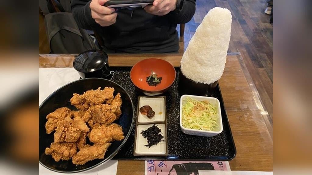 群馬片品村店家vs.記者:「讓您久等了,這是『激盛』炸雞定食。好誇張,飯好多,這通常只有漫畫裡才能看到吧。」