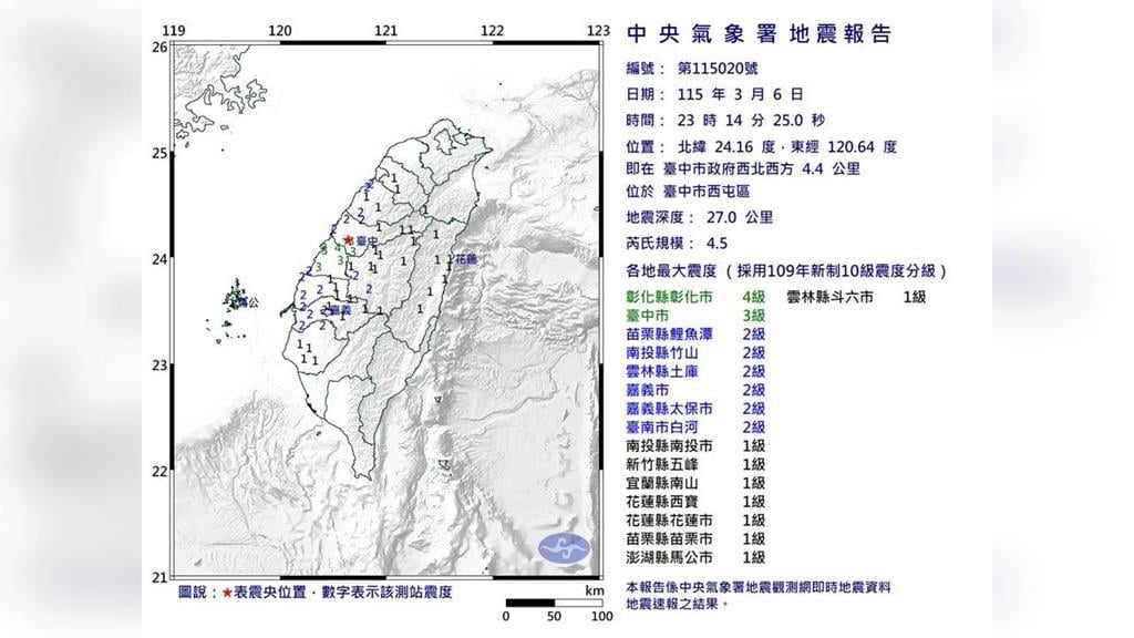 深夜晃一下!台中西屯23:14規模4.5地震 12縣市有感、最大震度4級