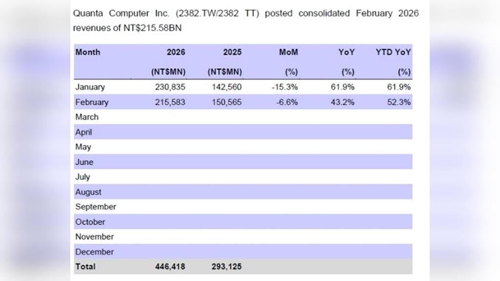 廣達依據IFRSs準則公告,2026年2月合併營收為新台幣2,155.83億元,較1月營收2,308.35億元月減6.6%,不過與去年同期1,505.65億元相比,年增43.2%。