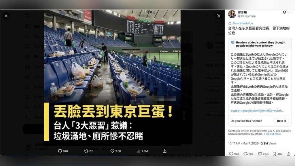 「丟臉到東京巨蛋」垃圾照狂傳!日媒親自報導:AI生成非真實現場
