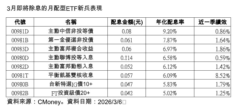 另一頭,檢視去年掛牌的月月配ETF新兵,有8檔將在3月除息,包含4檔主動債、2檔BBB級投等債、1檔美債,以及1檔股債平衡型ETF,年化配息率介於5.02%~9.2%之間,在股市震盪劇烈之際,投資吸引力浮現。