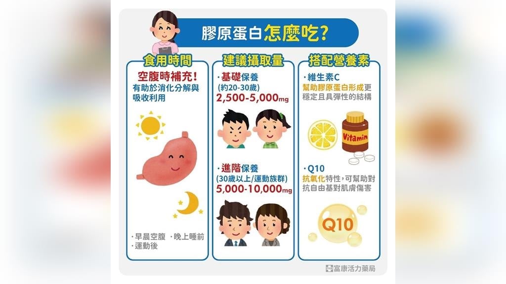 膠原蛋白屬於蛋白質類營養素,可在空腹時補充,例如:早上起床後或晚上睡前,或者是安排在運動後補充。 - 每日建議攝取量
