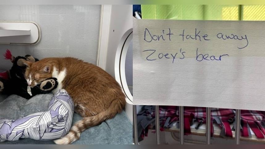 美國明尼蘇達州近日傳出一段令人鼻酸的故事,一隻名為佐伊(Zoey)的4歲橘貓,因飼主住進養老院無法繼續養牠,便被送往卡佛斯科特人道協會(CarverScott Humane Society)安置。令收容所員工心碎的是,當時佐伊的提籠上貼著一張字條,飼主請他們千萬不要拿走牠的小熊;該絨毛玩偶已成為佐伊唯一的心靈寄託。
