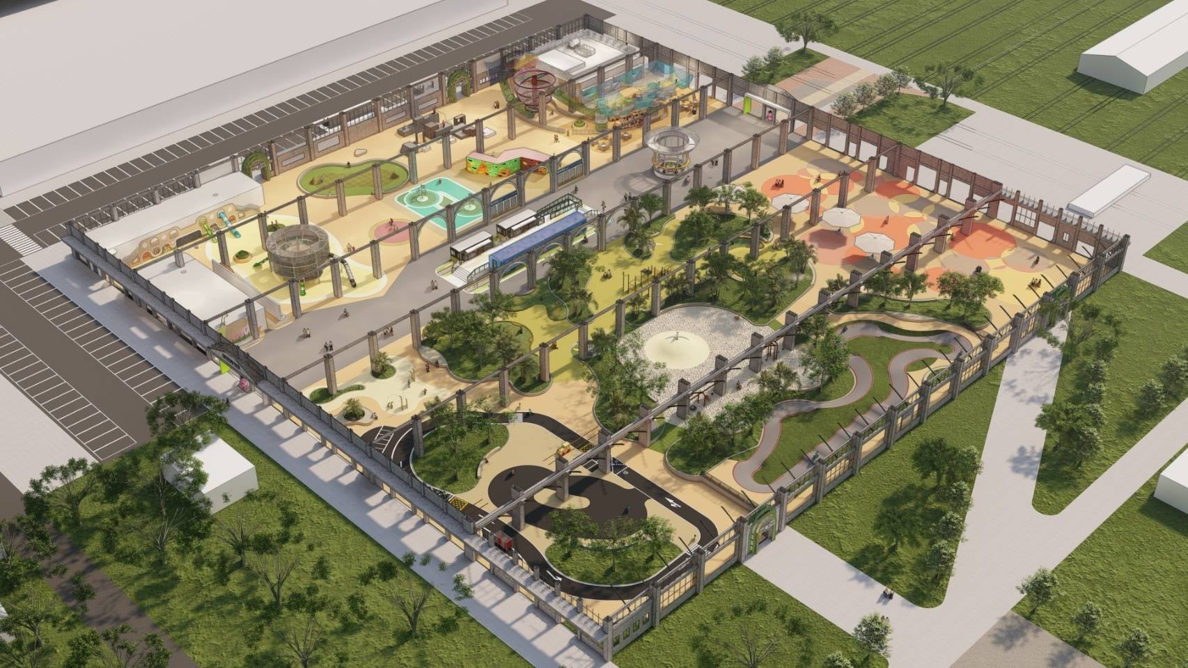 ↑圖說:園區保留貨車工場建築原貌,同時活化再利用廠內設施,兼顧文化保存與現代休憩需求。(圖片來源:模擬圖/高雄市工務局提供)