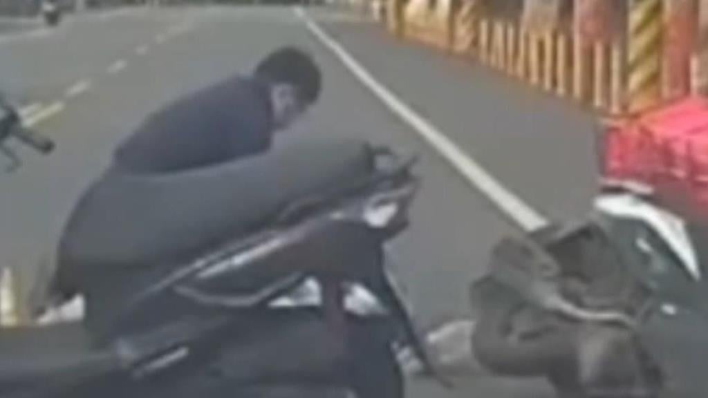 鳴笛的公務車,原地來個大迴轉,趕忙下車的,是一名警察,他目擊,兩輛機車都倒在地上,他直覺,應該有受傷嚴重的民眾,等待救援!女騎士自行站起來,到了路邊,但是,另一名騎士,卻是被壓在機車底下,員警試圖要拉他站起來,他卻全身癱軟無力!