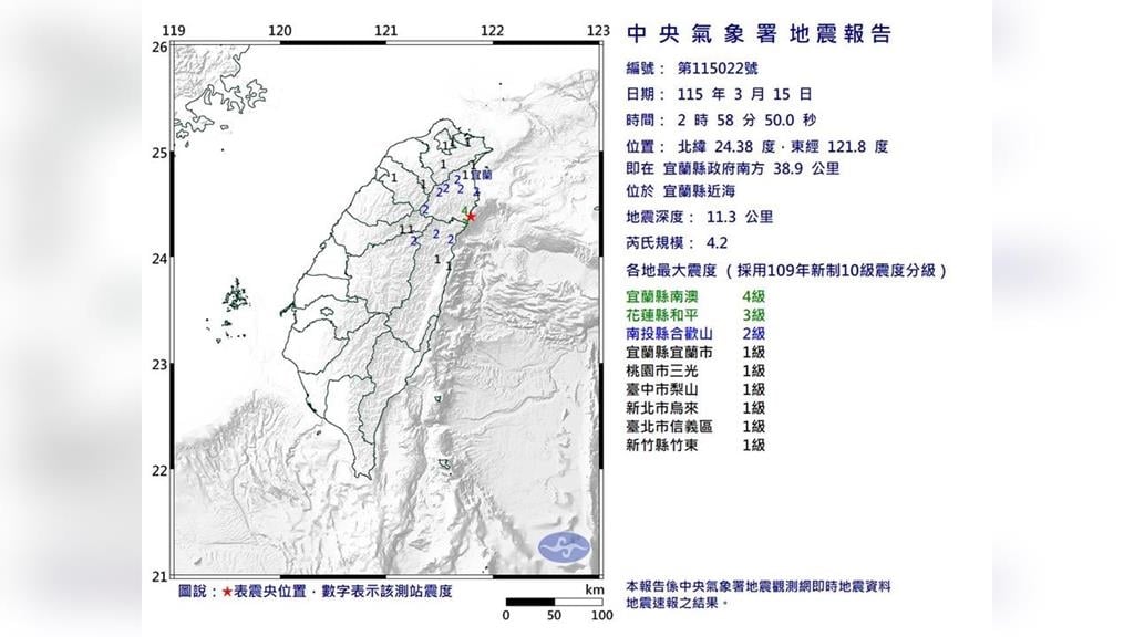 地牛深夜宜蘭翻身!今(15)日凌晨2時58分,宜蘭縣近海發生芮氏規模4.2地震,地震深度11.3公里。全台8縣市有感,各地最大震度宜蘭4級。