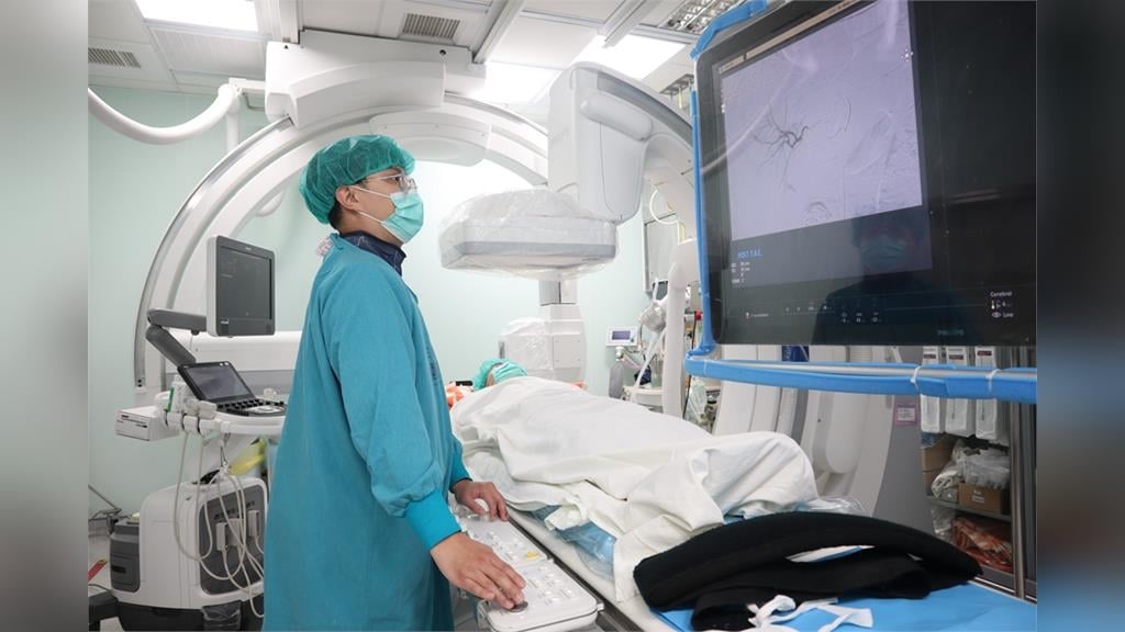 據了解,該名傷者因機車車禍猛烈撞擊,造成肝臟撕裂傷並出現腹腔內出血,送抵急診時血壓極度不穩,情況相當危急。醫療團隊在第一時間完成評估後,考量傷者已陷入失血性休克,若採傳統開腹手術,恐增加身體負荷與手術風險,因此迅速啟動跨團隊合作機制,由影像醫學部介入治療團隊接手,在血管攝影室執行微創血管內栓塞術,成功找出出血位置並完成止血,協助病人穩定生命徵象,爭取後續治療與恢復機會。