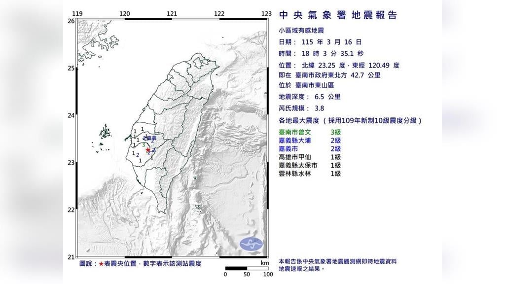 今(16)日下午6時03分,台南市東山區發生芮氏規模3.8地震,震央位在台南市政府東北方42.7公里處,震源深度僅6.5公里,屬於極淺層地震,台南市地區最大震度3級。