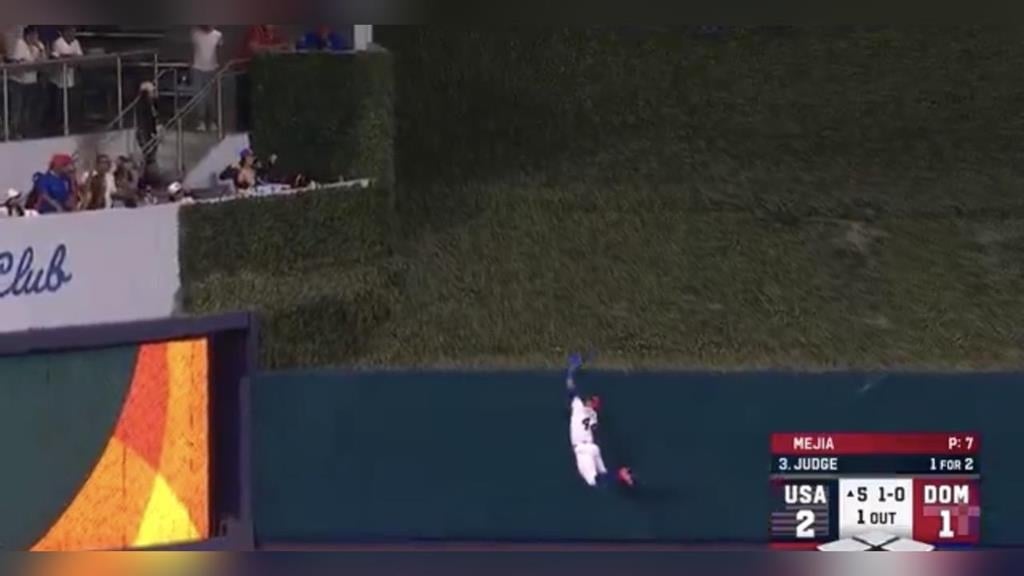 美國隊在5局上以2比1領先,當時壘上沒有跑者,法官賈吉(Aaron Judge)面對一顆98英里的四縫線直球,揮出一記中外野的深遠高飛球,全場球迷屏息以待,眼看就要形成一記追加比分的陽春砲,中外野手「J-Rod」羅德里奎茲(Julio Rodríguez)迅速向後退,在精準判斷落點後,於全壘打牆邊高高躍起,J-Rod 的手套在球即將越過牆頂的瞬間將其攔下,完成這記接殺後,J-Rod 興奮地揮舞手套,現場多明尼加球迷的歡呼聲幾乎掀翻屋頂。J-Rod這個精采的守備讓美國隊錯失一次可能擴大攻勢的機會。