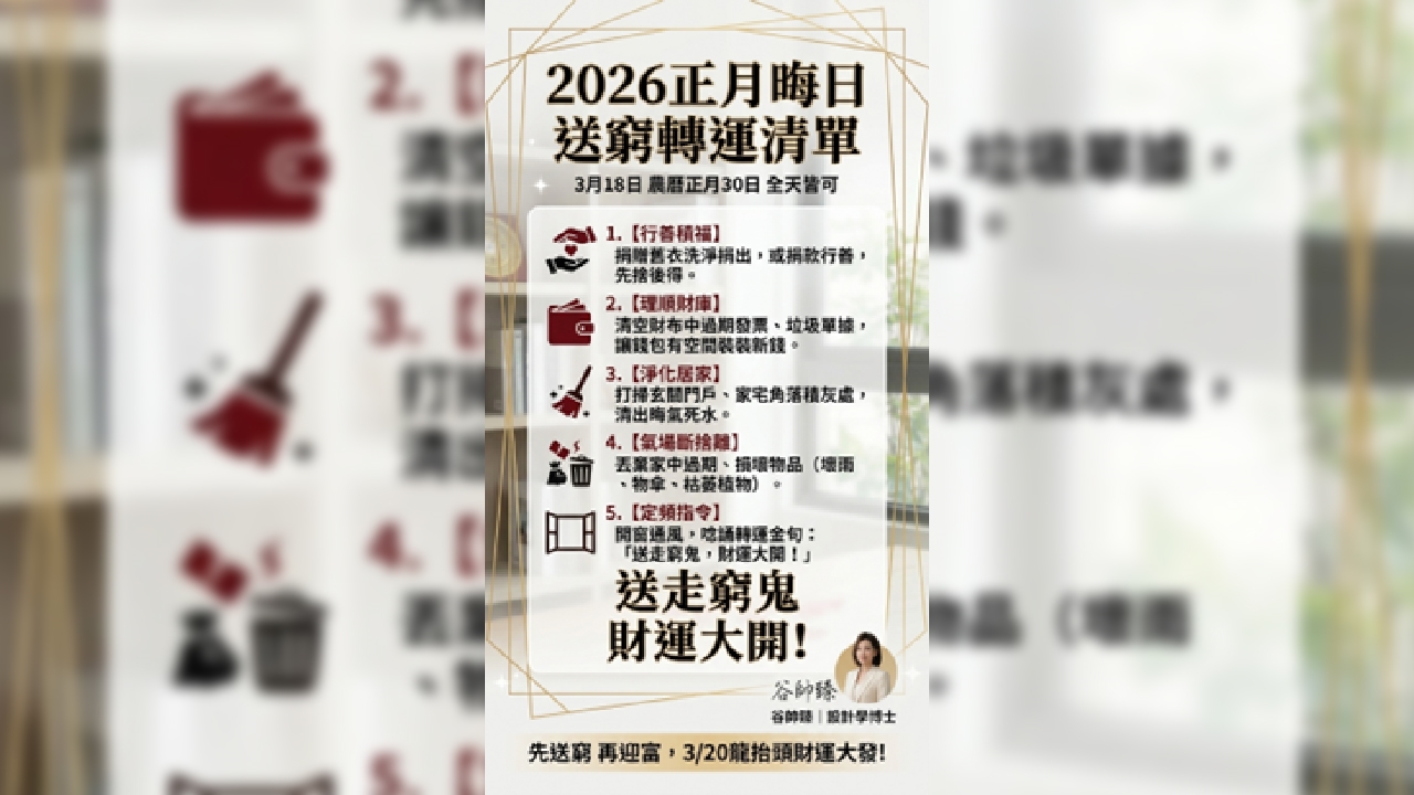 送窮的核心原則:「先捨後得」。當我們願意捨棄舊有、不好的習慣,並行善積德,才有空間容納新的福報與財富。谷帥臻老師提供2026年正月卅晦日送窮迎富完整儀開運步驟。