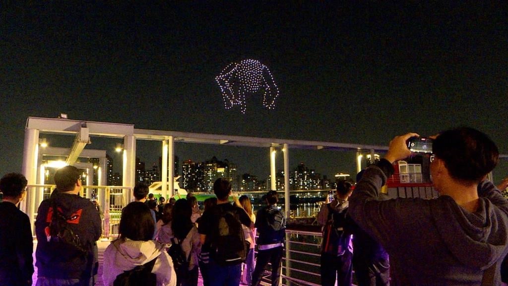 隨著一架架無人機起飛,點亮黑暗的夜空,無人機隊搭配著音樂,不斷變換隊形,排出太空船、模擬宇宙的畫面,讓人看的目不轉睛。