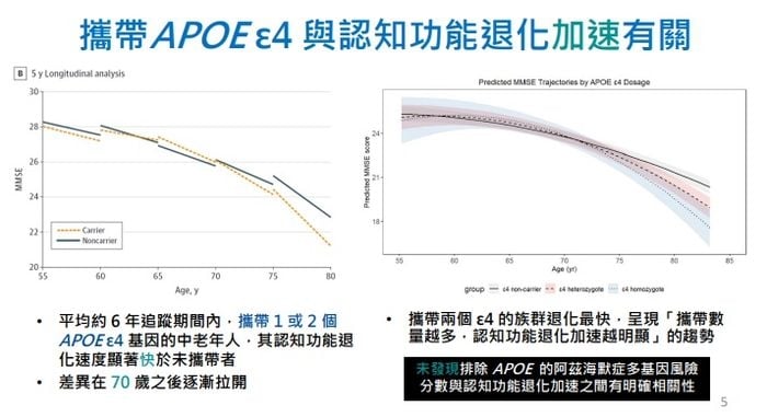 她進一步表示,APOE基因主要有ε2、ε3、ε4三種常見分型,每個人會從父母雙方各遺傳一個,形成不同組合。過去以白人為主的國外研究中發現,攜帶兩個APOE ε4基因者,失智症發病年齡提早7至10年,且65歲時大腦多已出現明顯的類澱粉蛋白沉積與認知退化症狀。此外,研究也觀察到,在尚未發病的健康階段,帶有APOE ε4基因也與認知功能加速退化相關。