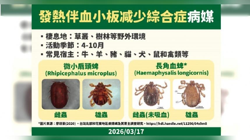 衛福部疾管署17日公布國內第3例致死率最高可達3成的「發熱伴血小板減少綜合症」(SFTS),北部一名70多歲男性出現全身無力症狀,因發燒、血小板低下等症狀住院,經2週治療後已出院。疾管署提醒,4月至10月為國內蜱蟲活動季節,蜱蟲可能傳播萊姆病、Q熱、SFTS等疾病,建議民眾前往草叢、樹林等環境時,可以穿著淺色長袖衣褲、手套及長靴等保護性衣物,並將褲管塞進襪子或鞋子裡,以降低遭蜱蟲叮咬機會。