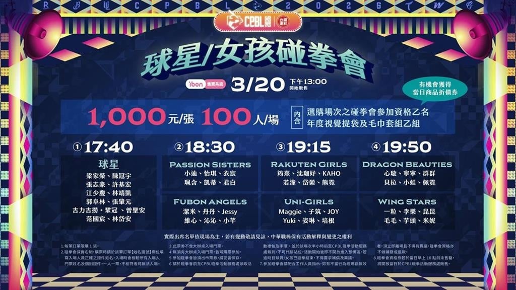 「球星女孩碰拳會」更是不容錯過的亮點活動,碰拳會資格券將於明(20)日下午13點於ibon售票系統開賣,每張售價1,000元,每場限量100名,共4場。凡購買資格券者,除可參加碰拳會外,還可獲得年度視覺提袋及中華職棒毛巾套組,內容超值。